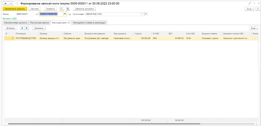 1.09.2022 года поступил акт №12 от РОСТОВИМУЩЕСТВО с которым заключен договор аренды здания на сумму 180 000 рублей (НДС 20% в том числе). Нам необходимо в программе создать документ «Поступление (акты, накладные, УПД) («Покупки» - «Поступление (акт, накладные УПД»). При создании документа поступления необходимо создать договор арены с контрагентом, в котором указать, что организация выступает в качестве налогового агента.