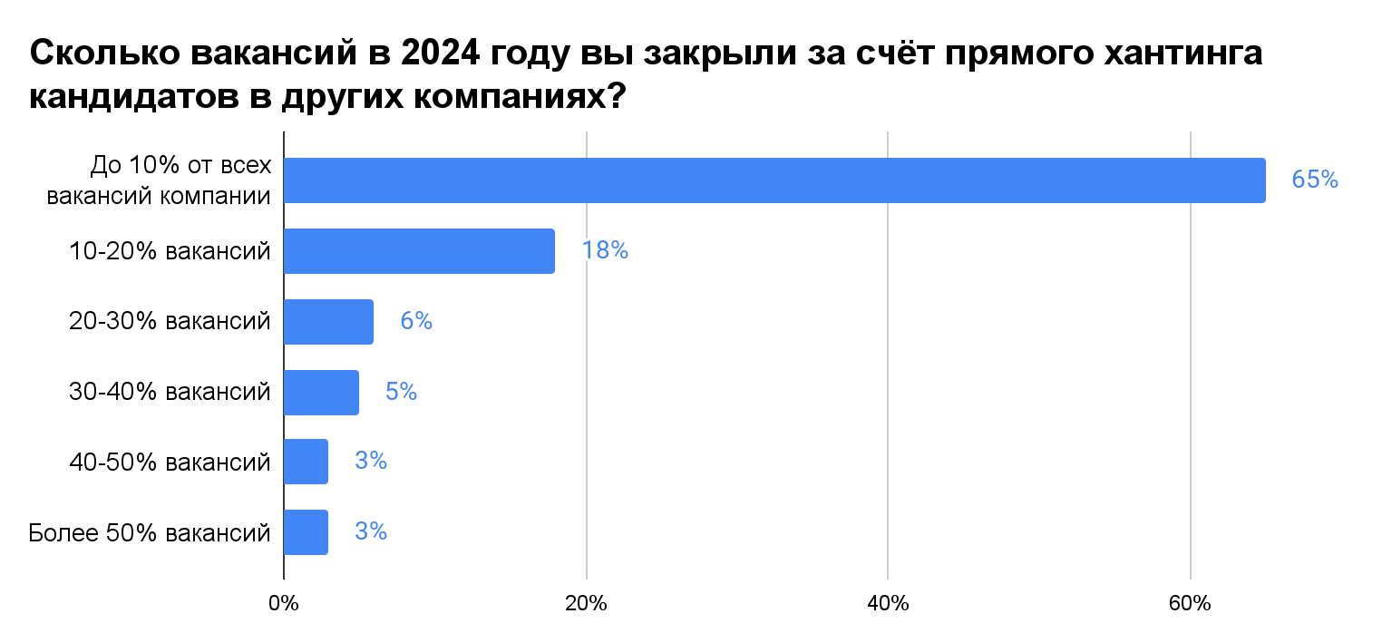 В 2024 году 65% российских работодателей, которые практикуют прямой хантинг сотрудников из других компаний, закрыли таким образом каждую десятую открытую вакансию. Ещё 18% компаний переманили у конкурентов в среднем каждого пятого нового работника, 14% наняли так до половины сотрудников. Как выяснили1 эксперты облачной CRM-системы для рекрутинга Talantix (входит в HR-экосистему сервисов hh.ru), привлекать “чужих” сотрудников удаётся далеко не только за счёт более высокой заработной платы. Важнейшую роль играют дружелюбная атмосфера в коллективе, доброжелательное и заботливое отношение к сотрудникам, интересные задачи и возможности для карьерного роста.