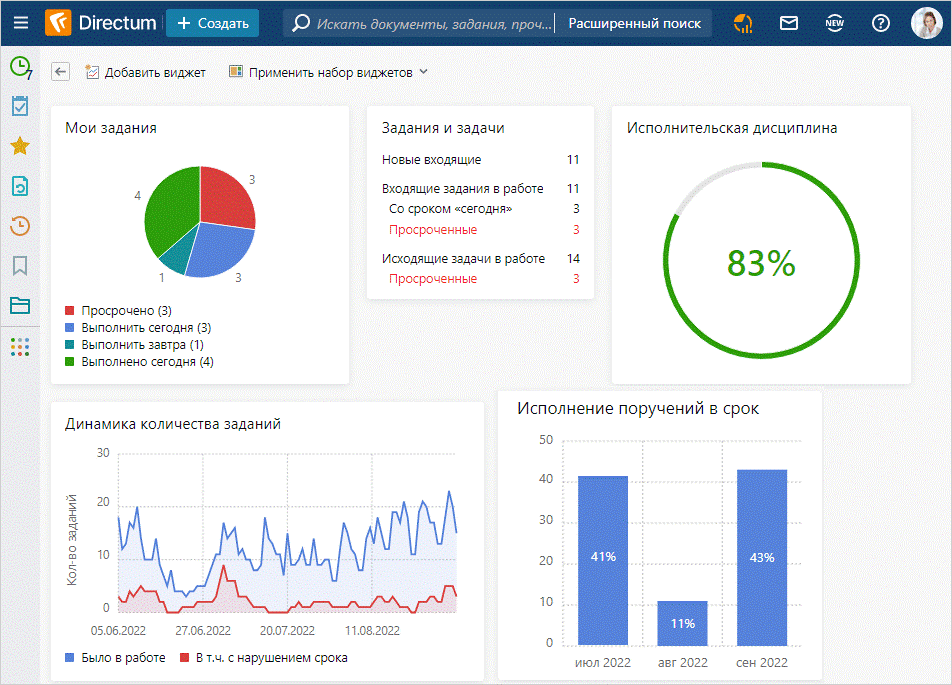 Еще одна фишка — это виджеты, которые помогают всем: с их помощью специалисты оценивают объем задач в работе, руководители мониторят уровень исполнительской дисциплины и загрузку подчиненных, а топ-менеджеры смотрят на процессы сверху.