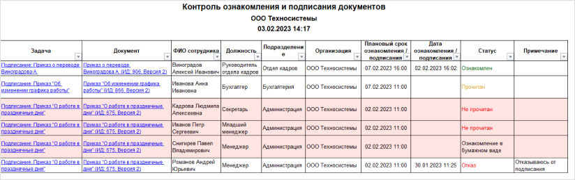 Но как кадровику проверить, кто уже выполнил задание, а кто его ещё не открывал? Очередной полезный инструмент из нашего списка — лист ознакомления, который можно сформировать в пару кликов, в том числе по всему подразделению или организации.